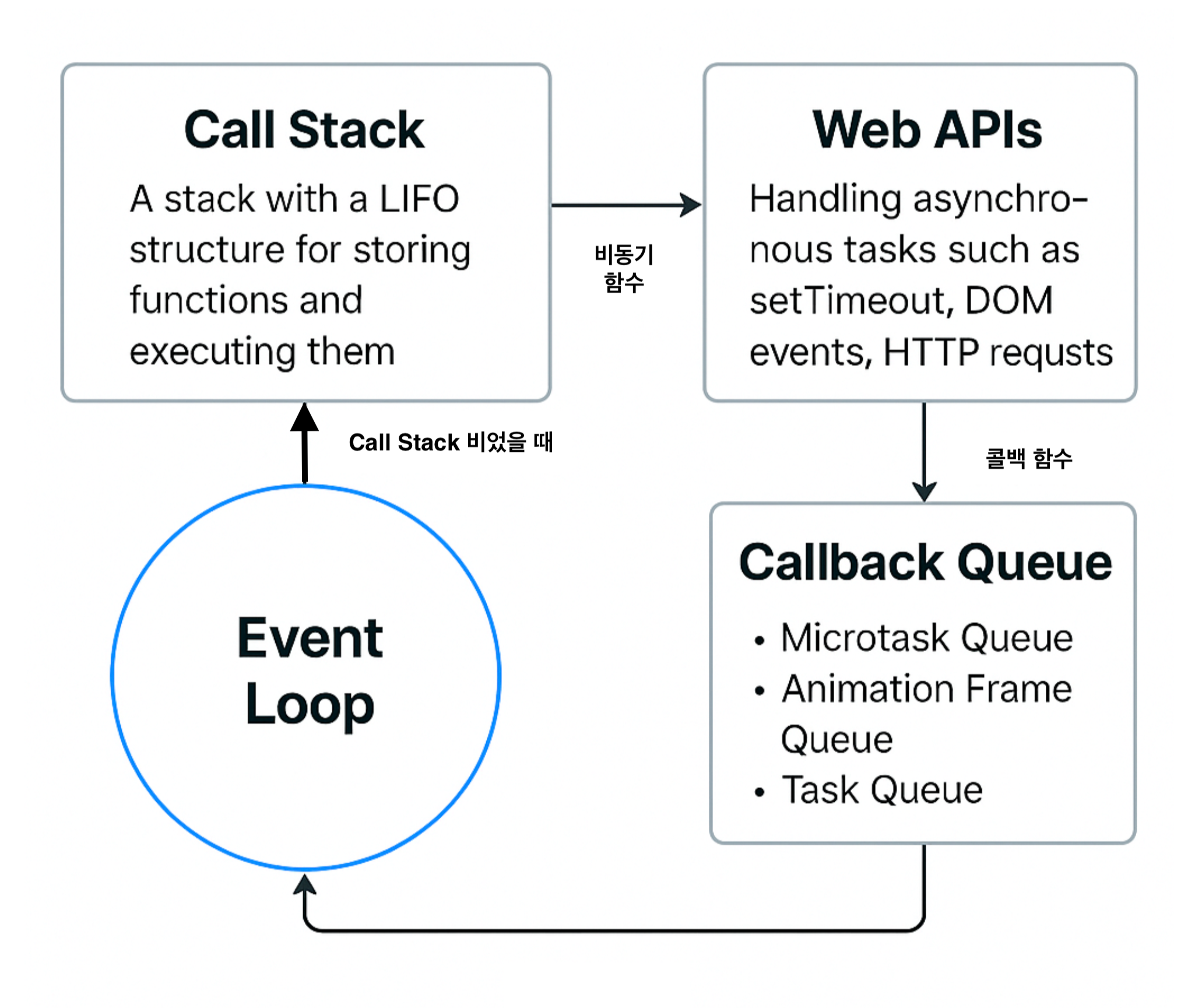 - 브라우저는 setTimeout, DOM 이벤트, HTTP 요청(Fetch/AJAX), requestAnimationFrame 등 다양한 비동기 작업을 처리할 수 있도록 Web APIs를 제공한다.