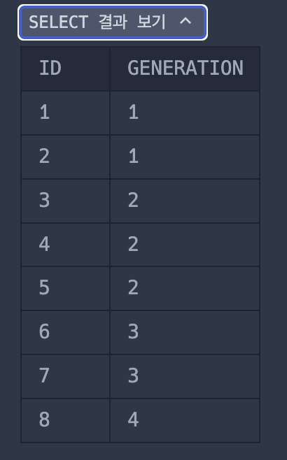 각 대장균(ID)이 몇 번째 세대인지 나타내는 테이블을 작성하시오.